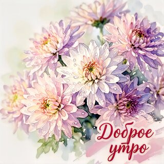 Красивая акварельная открытка с нежным букетом розовых и сиреневых хризантем. На лепестках цветов видны реалистичные капли росы, создающие эффект свежести. Нежные пастельные тона и мягкое освещение создают уютную, утреннюю атмосферу. В нижней части изображения расположена элегантная надпись на русском языке «Доброе утро», написанная каллиграфическим красным шрифтом. Идеально подходит для отправки в мессенджерах и социальных сетях для пожелания доброго утра близким и друзьям.