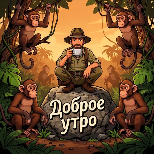 Атмосферная и добрая иллюстрация в стиле мультфильма, изображающая исследователя в шляпе, сидящего на камне в окружении дружелюбных обезьян в тропическом лесу. На переднем плане крупная надпись на русском языке «Доброе утро». Теплые золотистые тона рассвета создают уютное и позитивное настроение. Идеально подходит для пожеланий доброго утра в социальных сетях, открыток и мессенджеров.
