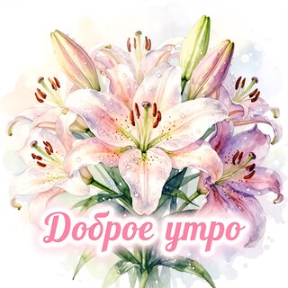 Красивая акварельная иллюстрация с пышным букетом нежных розовых лилий, покрытых капельками росы. На переднем плане стильная надпись «Доброе утро» розовым цветом. Идеально подходит для создания поздравительных открыток, душевных пожеланий доброго утра в мессенджерах и соцсетях, а также для оформления весеннего или летнего контента в эстетике цветочной нежности.