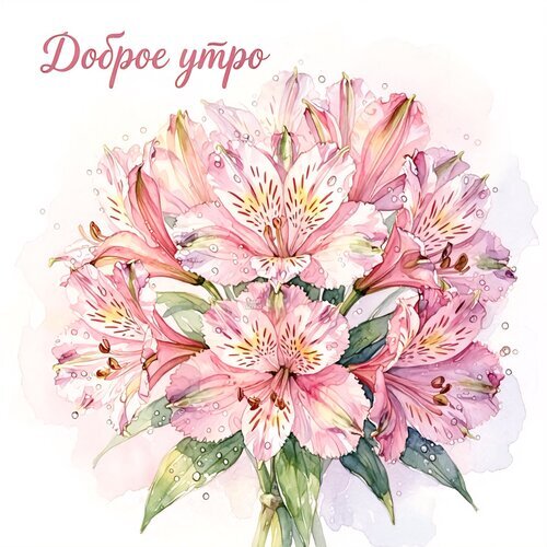 Нежная акварельная иллюстрация букета розовых альстрёмий на светлом фоне. Изящный цветочный натюрморт с каплями росы, передающий атмосферу свежести и утреннего спокойствия. Идеально подходит для поздравительных открыток, пожеланий доброго утра, оформления весеннего контента, создания эстетичных сторис и вдохновляющих постов в социальных сетях. Высокое качество детализации лепестков и мягкие пастельные тона создают ощущение легкости и романтики.
