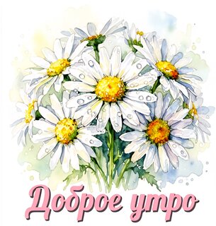 Красочная акварельная иллюстрация с букетом белоснежных ромашек. На лепестках цветов видны капли росы, что создает ощущение свежести и утренней прохлады. В нижней части изображения расположена красивая надпись розовым цветом «Доброе утро». Идеально подходит для использования в качестве поздравительной открытки, декора для социальных сетей или в качестве вдохновляющей картинки для пожелания доброго утра друзьям и близким. Нежные пастельные тона и мягкая техника рисования создают уютное и позитивное настроение.