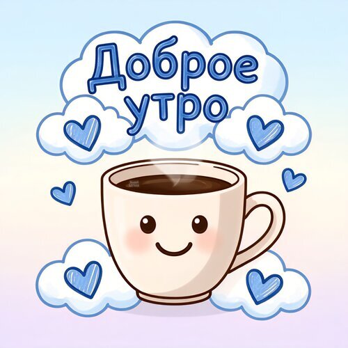 Милая и уютная векторная иллюстрация на тему «Доброе утро». В центре композиции — антропоморфная чашка кофе с улыбающимся личиком, окруженная пушистыми белыми облаками и голубыми сердечками. Сверху расположена надпись на русском языке «Доброе утро», выполненная в мягком мультяшном стиле. Изображение выполнено в нежной пастельной цветовой гамме с преобладанием голубого, белого и кофейного оттенков. Идеально подходит для поздравительных открыток, сторис в социальных сетях, мессенджеров и вдохновляющих утренних постов.