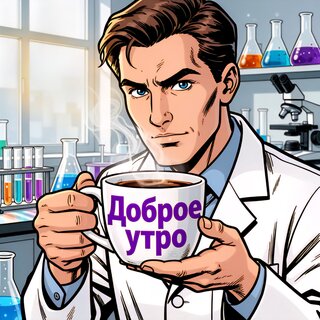 Иллюстрация в стиле комикса, изображающая уверенного молодого ученого или врача в белом халате, который держит чашку горячего кофе. На чашке крупная надпись на русском языке «Доброе утро». Действие происходит в светлой современной лаборатории с микроскопом, колбами и химическими реактивами на заднем плане. Картинка передает бодрое утреннее настроение, атмосферу науки, исследований и начала рабочего дня. Подходит для тематических блогов о науке, медицине, продуктивности и мотивации.