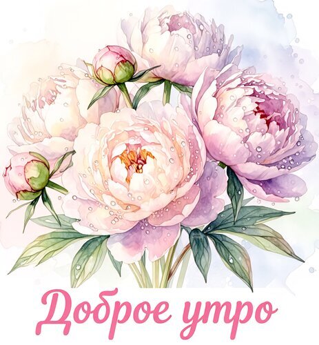 Красочная акварельная иллюстрация с пышным букетом нежно-розовых пионов. На лепестках цветов видны реалистичные капли росы, создающие эффект свежести. Изображение выполнено в светлых, пастельных тонах с мягкими переходами цвета. В нижней части картинки расположена красивая надпись на русском языке «Доброе утро», написанная розовым каллиграфическим шрифтом. Идеально подходит для поздравительных открыток, пожеланий доброго утра в социальных сетях и мессенджерах, а также для создания вдохновляющего контента в весенней или цветочной тематике.