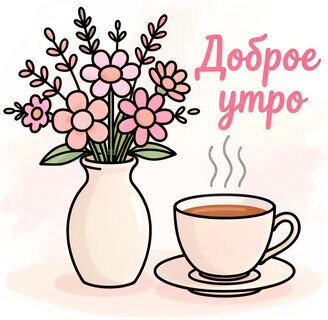 Милая и уютная иллюстрация, идеально подходящая для пожелания доброго утра. На картинке изображена вазочка с нежными розовыми цветами и чашка горячего ароматного кофе или чая, от которой исходит пар. Мягкие пастельные тона и надпись «Доброе утро» на русском языке создают теплую, позитивную и вдохновляющую атмосферу. Отличное изображение для рассылки в мессенджерах, соцсетях или для создания открыток, чтобы поднять настроение близким людям с самого начала дня.