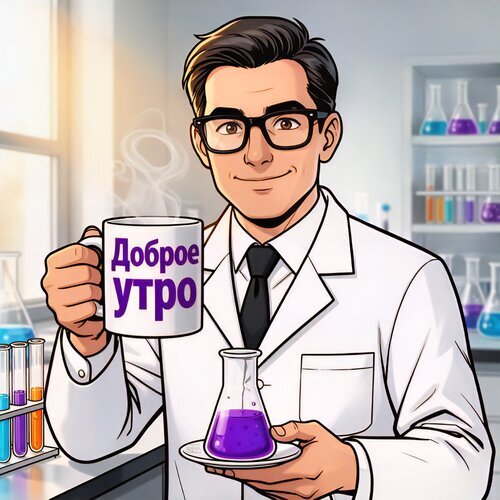 Иллюстрация в стиле комикса, изображающая улыбающегося молодого ученого или химика в белом халате и очках. Мужчина держит в одной руке дымящуюся кружку с надписью на русском языке «Доброе утро», а в другой — лабораторную колбу с фиолетовой жидкостью на подставке. Действие происходит в светлой современной лаборатории с полками, наполненными химической посудой и разноцветными растворами. Изображение передает позитивное, бодрое настроение начала рабочего дня в научной среде.