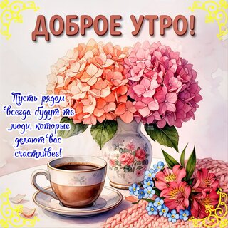 Красочная поздравительная открытка с пожеланием доброго утра. На изображении пышный букет розовых и персиковых гортензий в изящной вазе с цветочным узором, чашка ароматного кофе на блюдце и нежные цветы азалии. Поверх картинки наложен вдохновляющий текст на русском языке: " Доброе утро! Пусть рядом всегда будут те люди, которые делают Вас счастливее!". Идеально подходит для отправки в мессенджерах и социальных сетях для создания позитивного настроения близким и друзьям.