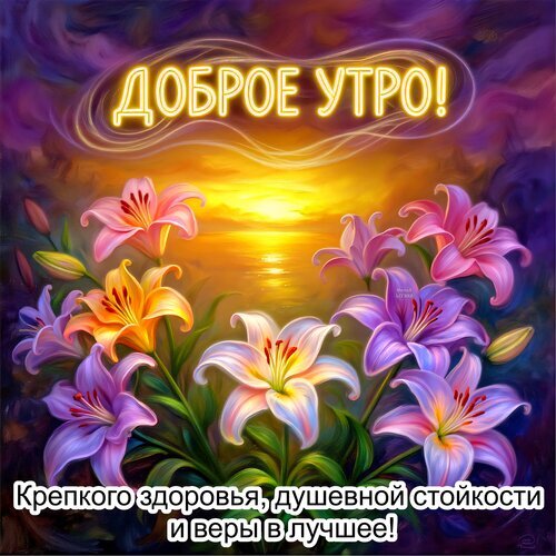 Красивая поздравительная открытка с надписью «Доброе утро!» на фоне живописного восхода. Композиция украшена пышными цветами лилий розовых, фиолетовых и белых оттенков. В нижней части изображения расположено теплое пожелание: «Крепкого здоровья, душевной стойкости и веры в лучшее!». Идеально подходит для отправки друзьям и близким в мессенджерах и социальных сетях для создания позитивного настроения с самого утра.