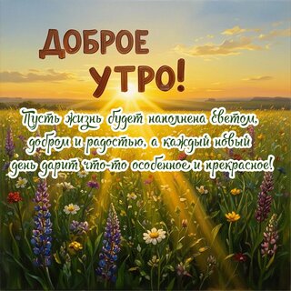 Красивая открытка с пожеланием доброго утра на фоне живописного летнего пейзажа. На изображении запечатлен солнечный рассвет над цветущим лугом с полевыми цветами: лавандой, ромашками и другими полевыми растениями. Золотистые лучи солнца пробиваются сквозь облака, создавая теплую и уютную атмосферу. На картинке на русском языке написан вдохновляющий текст: " Доброе утро! Пусть жизнь будет наполнена светом, добром и радостью, а каждый новый день дарит что-то особенное и прекрасное!". Идеально подходит для отправки в мессенджерах и социальных сетях в качестве утреннего приветствия.