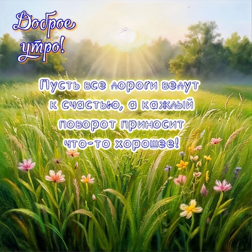 Красочная поздравительная открытка с пожеланием доброго утра. На изображении запечатлен живописный летний пейзаж: залитое солнечным светом луговое поле с высокой зеленой травой и яркими полевыми цветами. На фоне виднеется мягкий солнечный свет, пробивающийся сквозь листву деревьев, создавая атмосферу уюта и спокойствия. Поверх картинки наложен вдохновляющий текст на русском языке: «Доброе утро! Пусть все дороги ведут к счастью, а каждый поворот приносит что-то хорошее!». Идеально подходит для отправки друзьям и близким в мессенджерах и социальных сетях для поднятия настроения.