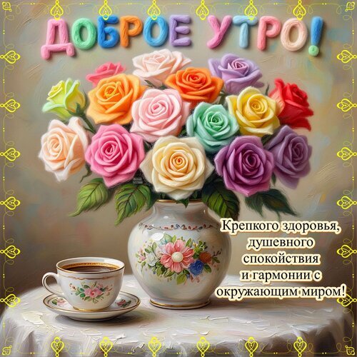 Красивая открытка с пожеланием доброго утра. На изображении представлен пышный букет разноцветных роз в изящной вазе, стоящей рядом с чашкой ароматного кофе на столе. На фоне надпись «Доброе утро!» и текст с пожеланиями крепкого здоровья, душевного спокойствия и гармонии с окружающим миром. Идеально подходит для отправки друзьям, близким и коллегам в мессенджерах и социальных сетях для создания позитивного настроения с самого утра.