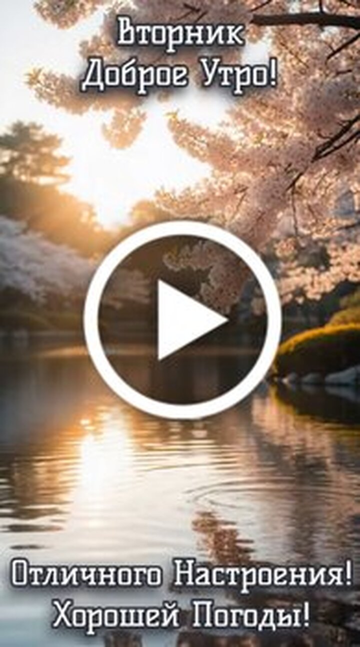 Красивое видео для пожелания доброго утра во вторник. На видео представлен спокойный и живописный пейзаж с цветущей сакурой на берегу тихого озера. Солнечный свет мягко пробивается сквозь ветви деревьев и отражается в водной глади, создавая атмосферу умиротворения и тепла. Текст на экране приветствует зрителей и желает отличного настроения и хорошей погоды. Это идеальный ролик для того чтобы поделиться позитивными эмоциями и вдохновить близких на успешный и радостный день.