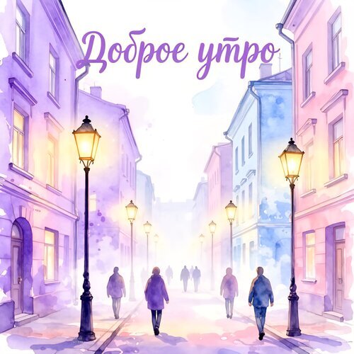 Акварельная иллюстрация в нежных пастельных тонах, изображающая уютную европейскую улочку ранним утром. На картине видны силуэты людей, прогуливающихся по освещенной фонарями мостовой, и красивые здания в фиолетовых, розовых и голубых оттенках. Надпись «Доброе утро» на русском языке придает изображению приветственный и позитивный настрой. Идеально подходит для открыток, пожеланий доброго утра в социальных сетях и создания атмосферы спокойствия и уюта.