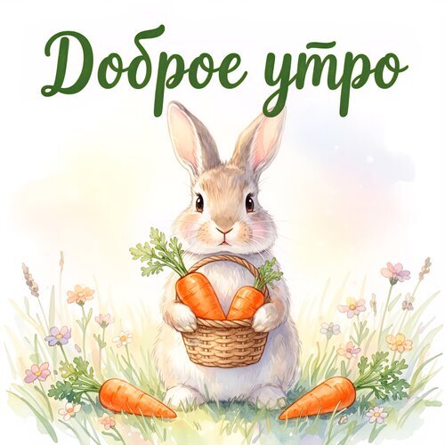 Милая и уютная иллюстрация с изображением пушистого кролика, который держит корзинку с морковкой. На картинке красуется красивая надпись на русском языке «Доброе утро». Композиция выполнена в нежных пастельных тонах с цветами и травой на фоне, что создает весеннее, светлое и позитивное настроение. Идеально подходит для использования в качестве поздравительной открытки, сторис или поста в социальных сетях для пожелания доброго утра друзьям и близким.