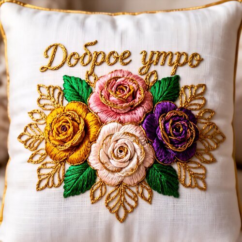Декоративная белая подушка с изысканной вышивкой в цветочном стиле. На центральной части подушки изображены объемные розы розового, желтого, белого и фиолетового цветов, дополненные зелеными листьями и золотистыми узорами. Сверху расположена надпись «Доброе утро», выполненная золотистыми нитями. Подушка имеет золотистую окантовку по краям, что придает ей элегантный и праздничный вид. Отличный вариант для украшения интерьера спальни или гостиной, а также прекрасный подарок для создания уютной атмосферы утром.