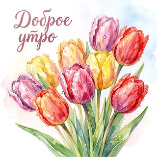 Живописная акварельная иллюстрация с букетом разноцветных тюльпанов. На нежных лепестках розовых, желтых, красных и фиолетовых цветов видны капли росы, создающие эффект свежести. В левом верхнем углу элегантная надпись каллиграфическим шрифтом на русском языке «Доброе утро». Изображение выполнено в светлых пастельных тонах на мягком акварельном фоне, что делает его идеальным для поздравительных открыток, весенних пожеланий и вдохновляющих картинок для соцсетей.