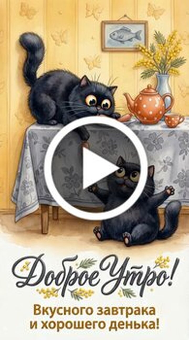 Милое анимационное видео для доброго утра. Сюжет повествует о двух забавных черных котах, которые устроили завтрак. Один кот сидит за столом с широко открытыми глазами, а другой незаметно протягивает лапу через край скатерти, чтобы передать угощение. На столе стоит чайник, чашка и тарелка с едой, создавая уютную домашнюю атмосферу. Видео наполнено позитивом и идеально подходит для того, чтобы пожелать близким вкусного завтрака и хорошего дня.
