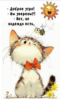 Милая и забавная векторная иллюстрация с рыжим котенком, одетым в красный галстук-бабочку. На картинке представлен юмористический диалог: «- Доброе утро! - Вы уверены?! - Нет, но надежда есть». Композицию дополняют улыбающееся солнце, летящая пчела и весенние цветы. Идеально подходит для использования в качестве утреннего приветствия, позитивной открытки или мемного изображения для поднятия настроения в социальных сетях.
