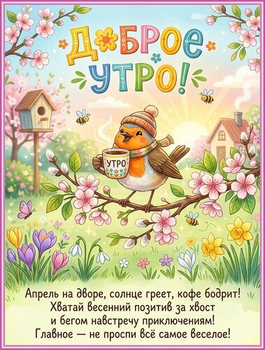 Красочная и позитивная открытка на тему доброго утра с изображением милого птички, пьющей кофе на ветке цветущего дерева. Иллюстрация выполнена в весенних тонах: цветущие сакуры, подснежники, нарциссы и солнечный свет создают атмосферу уюта и радости. На картинке присутствует текст на русском языке: «Доброе утро!» и мотивирующая цитата про апрель, кофе и весенний позитив. Идеально подходит для поздравлений, пожеланий хорошего дня и создания весеннего настроения в социальных сетях.