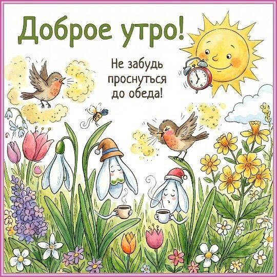 Яркая и добрая весенняя иллюстрация с надписью «Доброе утро! Не забудь проснуться до обеда!». На картинке изображен солнечный пейзаж: веселое солнце с будильником, поющие птицы, распускающиеся цветы (тюльпаны, подснежники, маргаритки) и маленькие персонажи-цветочки, которые пьют кофе. Иллюстрация выполнена в нежной акварельной стилистике, идеально подходит для поздравительных открыток, пожеланий доброго утра и создания весеннего настроения.