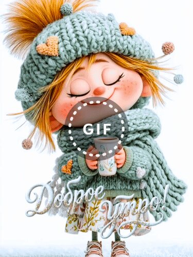 Милая и уютная открытка с изображением очаровательной маленькой девочки в вязаной зимней одежде. Девочка одета в нежно-голубую шапку с помпонами и декоративными сердечками, а также в теплый вязаный свитер. Она с закрытыми глазами и счастливой улыбкой держит в руках кружку горячего напитка, излучая спокойствие и радость. На фоне видна надпись серебристым каллиграфическим шрифтом «Доброе утро!». Изображение выполнено в стиле 3D-анимации с детальной проработкой текстуры вязки и мягкого освещения, что создает атмосферу тепла, уюта и зимнего волшебства. Идеально подходит для поздравительных открыток и пожеланий доброго утра.