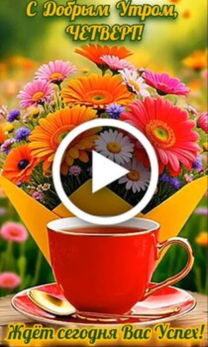 Красивое и позитивное видео для пожелания доброго утра в четверг. На ярком фоне изображен пышный букет разноцветных гербер в желтой упаковке, рядом стоит чашка горячего чая или кофе в красной кружке. В композицию гармонично вписана красивая бабочка, добавляющая видео живости и эстетики. Это идеальное видео для отправки друзьям, близким и коллегам, чтобы поднять настроение и пожелать успешного и радостного четверга. На видео присутствуют текстовые надписи "С добрым утром, четверг!" и "Ждет сегодня вас успех!"