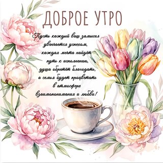 Красивая и вдохновляющая открытка на тему «Доброе утро». На нежном акварельном фоне изображен пышный букет розовых пионов и разноцветных тюльпанов в прозрачной вазе. В центре композиции — чашка ароматного кофе, создающая уютную атмосферу. На картинке размещен мотивирующий текст на русском языке: пожелание успеха в делах, исполнения мечтаний и гармонии в семье. Идеальное изображение для отправки близким, друзьям или коллегам в мессенджерах (WhatsApp, Viber) для создания позитивного настроения с самого утра.