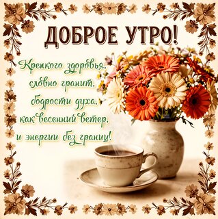 Красивая поздравительная открытка с пожеланием доброго утра. На изображении представлен пышный букет ярких гербер в вазе и чашка горячего кофе на светлом фоне. Композиция украшена изящной цветочной рамкой в теплых тонах. На картинке размещен текст на русском языке: «Доброе утро! Крепкого здоровья, словно гранит, бодрости духа, как весенний ветер, и энергии без границ!» Идеально подходит для отправки друзьям и близким в мессенджерах и социальных сетях для создания позитивного настроения с самого утра.