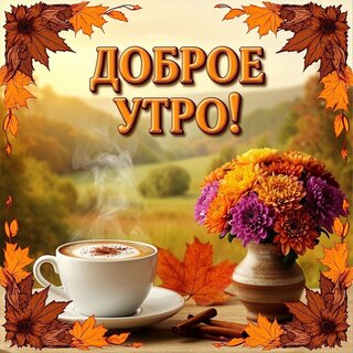 Красочная поздравительная открытка с надписью «Доброе утро!», выполненная в осенней тематике. На изображении уютная композиция: чашка горячего кофе с пенкой и корицей, пылающий аромат, яркий букет осенних хризантем (оранжевых и фиолетовых оттенков) в вазе и декоративная рамка из золотистых кленовых листьев. Теплые тона, мягкий солнечный свет и осенний пейзаж на фоне создают атмосферу уюта, тепла и позитивного начала дня. Идеально подходит для отправки друзьям и близким в мессенджерах и социальных сетях для создания осеннего настроения.