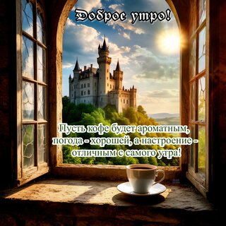 Уютная и вдохновляющая открытка для доброго утра. На изображении представлен вид из открытого окна на величественный средневековый замок на фоне солнечного неба. На подоконнике стоит чашка горячего ароматного кофе. Картинка наполнена светом и теплом, создавая атмосферу сказки и спокойного начала дня. Текст на русском языке гласит: «Доброе утро! Пусть кофе будет ароматным, погода — хорошей, а настроение — отличным с самого утра!» Идеально подходит для отправки друзьям и близким в мессенджерах и социальных сетях для поднятия настроения.