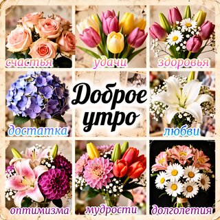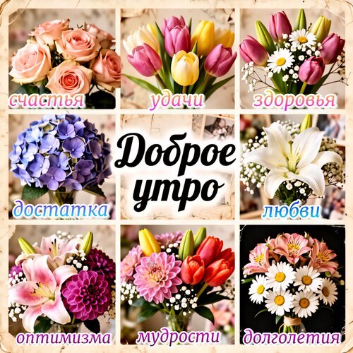 Коллаж ��з красивых цветочных букетов с пожеланиями на русском языке: «счастья», «удачи», «здоровья», «достатка», «любви», «оптимизма», «мудрости» и «долголетия». Яркие композиции из роз, тюльпанов, лилий, хризантем и ромашек на фоне надписи «Доброе утро». Идеальное изображение для открытки, поздравления и передачи позитивных эмоций утром.