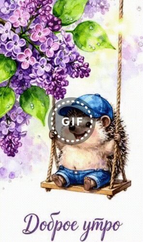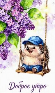 Милая и очаровательная иллюстрация с ежиком, который весело качается на качелях. Ежик одет в синюю кепку и джинсовые шорты, на фоне пышных ветвей фиолетовой сирени. Картинка наполнена весенним настроением, уютом и нежностью. Подпись «Доброе утро» делает это изображение идеальным для отправки близким, друзьям и любимым в качестве пожелания хорошего начала дня. Качественная акварельная графика в пастельных тонах.