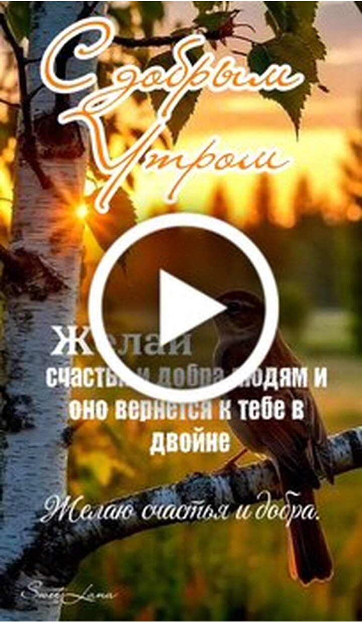 Это короткое вдохновляющее видео наполнено теплом и позитивными пожеланиями. На фоне красивого заката и березовой рощи запечатлена маленькая птица сидящая на ветке. Текст на видео призывает желать счастья и добра окружающим людям ведь это добро обязательно вернется к вам в двойном размере. Видео идеально подходит для создания хорошего настроения и доброго начала дня.
