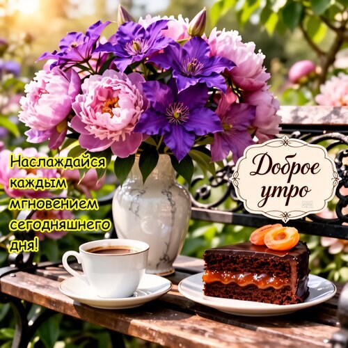 Красивое и вдохновляющее изображение для пожелания доброго утра. На переднем плане на деревянной скамейке в саду стоит ваза с пышным букетом из нежно-розовых пионов и ярких фиолетовых клематисов. Рядом расположились чашка горячего кофе и аппетитный кусочек шоколадного торта с абрикосовой начинкой. Солнечный свет и зелень сада создают атмосферу уюта и спокойствия. На картинке присутствует надпись на русском языке: «Наслаждайся каждым мгновением сегодняшнего дня!» и декоративная плашка «Доброе утро». Идеально подходит для открыток, социальных сетей и утренних пожеланий.