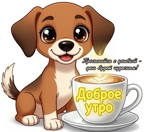 Милая и добрая открытка для хорошего начала дня. На изображении представлен очаровательный мультяшный щенок с большими блестящими глазами, сидящий рядом с чашкой ароматного кофе с сердечком из молочной пенки. Текст на русском языке гласит: «Доброе утро» и «Просыпайся с улыбкой — день будет чудесным!». Идеально подходит для отправки друзьям, близким и любимым в мессенджерах и социальных сетях, чтобы подарить позитивное настроение и пожелать прекрасного утра.