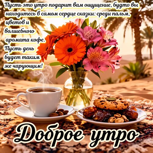 Уютное и вдохновляющее изображение для пожелания доброго утра. На переднем плане — чашка ароматного черного кофе на блюдце, рядом с которой лежат финики и орехи. В центре композиции — изящная стеклянная ваза с ярким букетом оранжевых гербер и розовых альстромерий. Фон представляет собой теплый пустынный пейзаж с пальмами в мягком свете заката или рассвета. На картинке нанесен красивый текст на русском языке с пожеланиями волшебного утра и чарующего дня. Идеально подходит для открыток, соцсетей и мессенджеров.