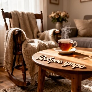 Уютная и теплая композиция, создающая атмосферу спокойного утра. На переднем плане деревянный столик, на котором стоит чашка горячего ароматного чая с поднимающимся паром. На столе видна стильная надпись «Доброе утро». На заднем плане — комфортное деревянное кресло-качалка, накрытое мягким вязаным пледом, и мягкое освещение, проникающее сквозь окно. Идеальное изображение для создания настроения уюта, домашнего тепла и безмятежного начала дня.