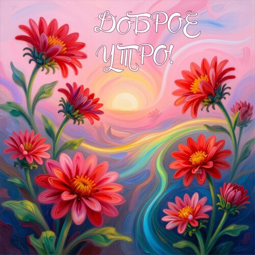 Красочная и яркая цифровая иллюстрация в стиле импрессионизма, посвященная теме «Доброго утра». На картине изображен живописный рассвет с мягким золотистым солнцем, встающим над волнистым, разноцветным пейзажем. На переднем плане крупным планом представлены пышные красные и розовые цветы, напоминающие герберы или астры, с детальной прорисовкой лепестков. Небо окрашено в нежные оттенки розового, фиолетового и голубого. В верхней части изображения расположена каллиграфическая надпись на русском языке «Доброе утро!». Изображение наполнено позитивной энергией, теплом и весенним настроением, идеально подходит для использования в качестве поздравительной открытки или обоев для рабочего стола.