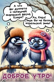 Забавная цифровая иллюстрация с двумя антропоморфными синими птичками, сидящими на ветке. Птицы изображены в мультяшном стиле с выразительными глазами и одеты в уютные зимние аксессуары: одна в шапке-ушанке с мехом, другая в розовой шапке с цветком и шарфе. Над ними расположены «облачка» с текстом на русском языке, создающие комичный диалог о «январской весне» и «апрельской зиме». В нижней части картинки крупная надпись «Доброе утро!». Изображение идеально подходит для отправки в мессенджерах и соцсетях в качестве позитивного утреннего приветствия или открытки.