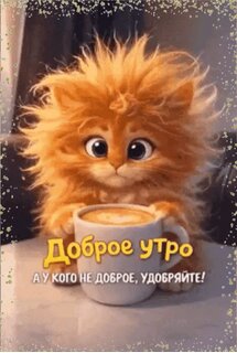 Милая и пушистая открытка с изображением рыжего котенка с большими выразительными глазами, который держит чашку кофе или какао. На картинке присутствует поздравительная надпись на русском языке: «Доброе утро, а у кого не доброе, удобряйте!». Изображение выполнено в теплых тонах, имеет декоративную сверкающую рамку, создающую уютное и позитивное настроение. Идеально подходит для отправки в мессенджерах и социальных сетях для создания хорошего настроения с самого утра.