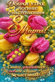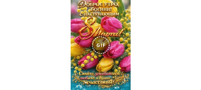 Анимированная открытка "Доброе утро, богини! С наступающим 8 Марта! Сияйте, улыбайтесь, любите и будьте счастливы!"