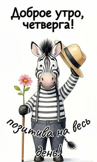Милая и позитивная открытка с изображением забавной зебры в шляпе и с цветком. На картинке надпись на русском языке: «Доброе утро, четверга! позитива на весь день!». Идеально подходит для отправки друзьям, близким и коллегам в мессенджерах (WhatsApp, Telegram) или социальных сетях, чтобы пожелать бодрого начала дня и отличного настроения в четверг. Иллюстрация выполнена в дружелюбном мультяшном стиле.