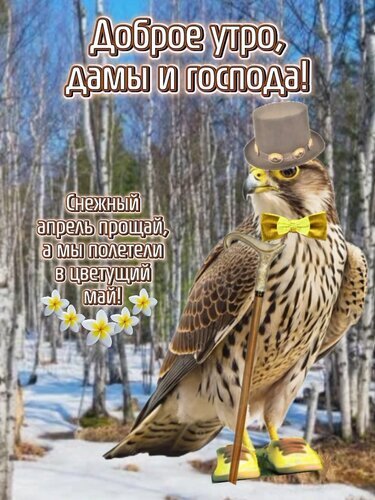 Забавное и веселое поздравительное изображение с антропоморфным соколом или ястребом в образе джентльмена. Птица одета в цилиндр, желтый галстук-бабочку и туфли, а в крыле держит трость. На фоне — зимний или ранневесенний лес с заснеженными березами. На картинке расположен текст на русском языке: «Доброе утро, дамы и господа! Снежный апрель прощай, а мы полетели в цветущий май!». Идеально подходит для рассылки добрых пожеланий в мессенджерах (WhatsApp, Viber) и социальных сетях для создания позитивного настроения весной.
