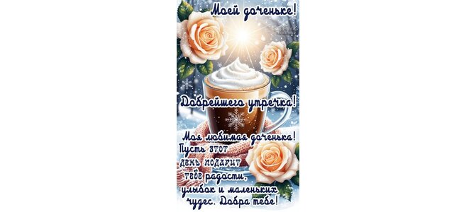 Теги:доченьке, доброе утро, цветы, розы, зима, снег, лес, кофе, чашка кофе, пожелания на каждый день, про счастье