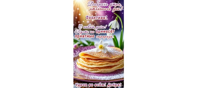 Теги:доброе утро, добрый день, блины, цветы, масленица, пожелания на каждый день, красивая картинка, зима, снег, удачи, добра, классных сюрпризов