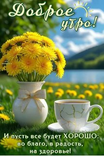 Красочное поздравительное изображение с надписью «Доброе утро!» на фоне солнечного пейзажа. В центре композиции — пышный букет ярко-желтых одуванчиков в белой вазе, украшенной золотистым бантом. Рядом стоит чашка кофе или чая с изящным золотистым узором. На заднем плане виден спокойный водоем, зеленые холмы и голубое небо с облаками. В нижней части картинки расположено теплое пожелание на русском языке: «И пусть все будет ХОРОШО: во благо, в радость, на здоровье!». Идеально подходит для открыток, рассылки в мессенджерах и социальных сетях для создания позитивного настроения утром.