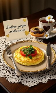 Уютный и романтичный завтрак на столе, сервированный для любимого человека. На переднем плане — аппетитный омлет с томатами и свежей зеленью на изящной тарелке. Рядом стоит чашка горячего чая с цветком ромашки, шоколадный пончик в форме сердца и открытка с надписью «Доброе утро, любимый!». Композиция на белой кружевной салфетке создает атмосферу нежности, тепла и заботы. Идеальное изображение для пожелания доброго утра и выражения любви.