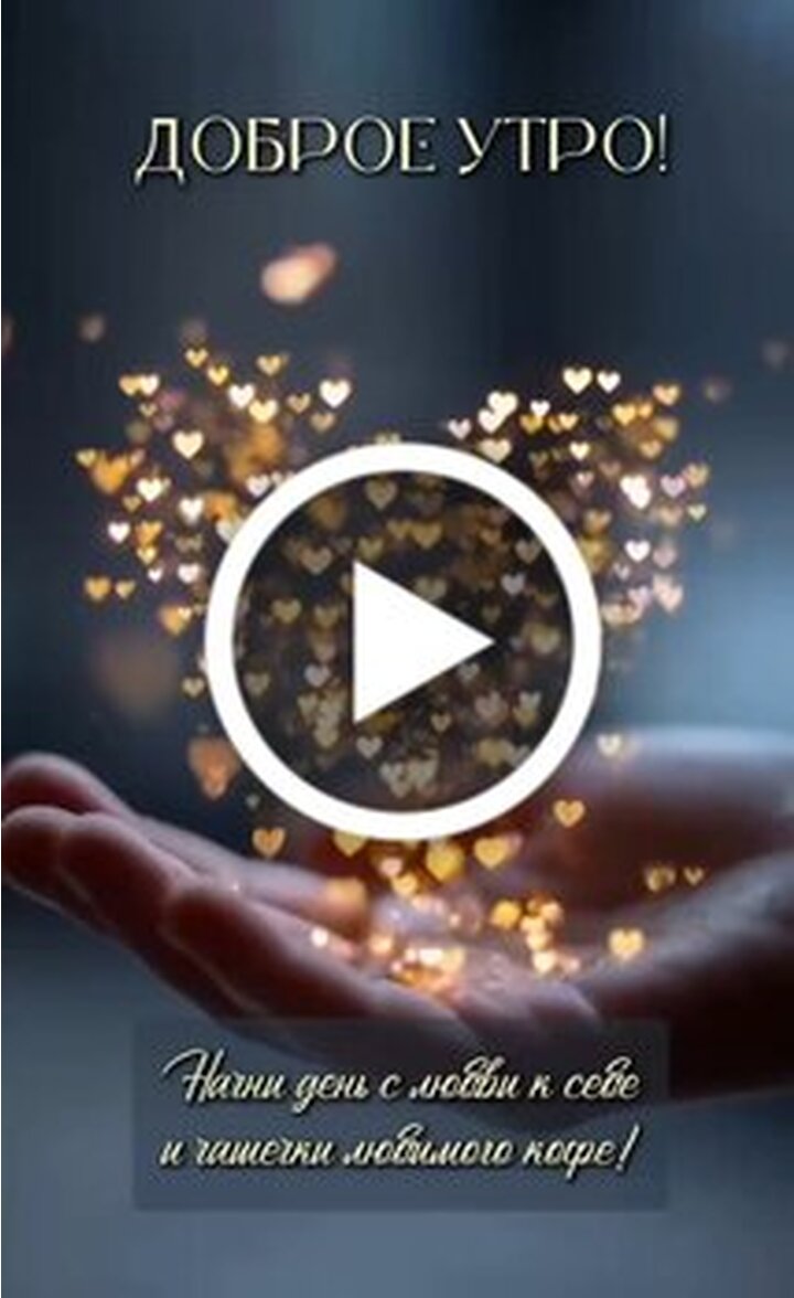 Красивое и теплое видео для доброго утра. На видео изображены руки, держащие чашку горячего кофе, которая наполнена светящимися золотыми сердцами. Из чашки поднимается легкий пар, а вокруг порхают искрящиеся частицы, создавая атмосферу уюта и магии. Надпись на видео желает начать день с любви к себе и чашечки любимого кофе. Это идеальное видео для того, чтобы подарить близким или подписчикам хорошее настроение и вдохновение с самого начала дня.