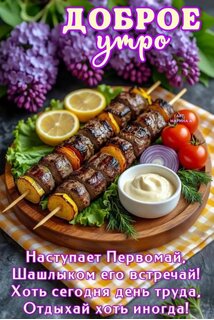 Открытка "ДОБРОЕ УТРО! НАСТУПАЕТ ПЕРВОМАЙ, ШАШЛЫКОМ ЕГО ВСТРЕЧАЙ! ХОТЬ СЕГОДНЯ ДЕНЬ ТРУДА, ОТДЫХАЙ ХОТЬ ИНОГДА"