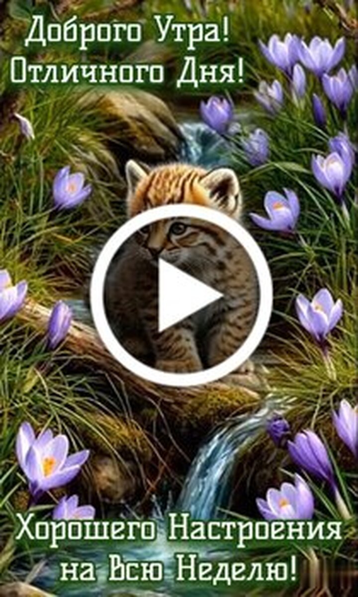 Это видео представляет собой милую и позитивную открытку для пожелания доброго утра. В центре сюжета находится очаровательный маленький котенок с полосатым окрасом, который сидит на поваленном дереве в живописном лесу. Вокруг котенка расцвели красивые фиолетовые цветы, а на заднем плане виден небольшой ручей. Текст на экране желает зрителям отличного дня и хорошего настроения на всю неделю. Видео наполнено уютом и нежностью, создавая спокойную и радостную атмосферу для начала нового дня.